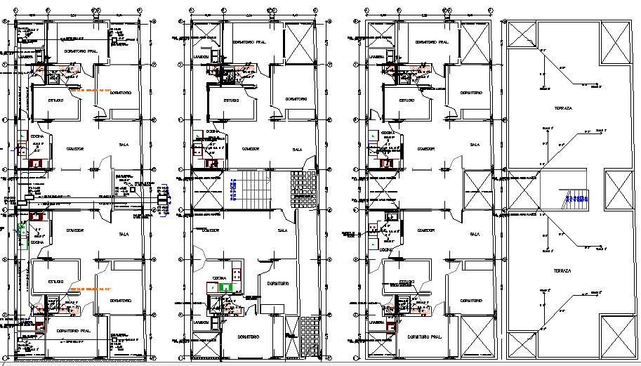 Multi Family Housing Flats Design and Architecture Layout that includes front and back elevation, detailed stair case elevation, doors and window elevation, section details including living area, hall, kitchen, bedrooms, dinning area, balcony and much more of housing design.