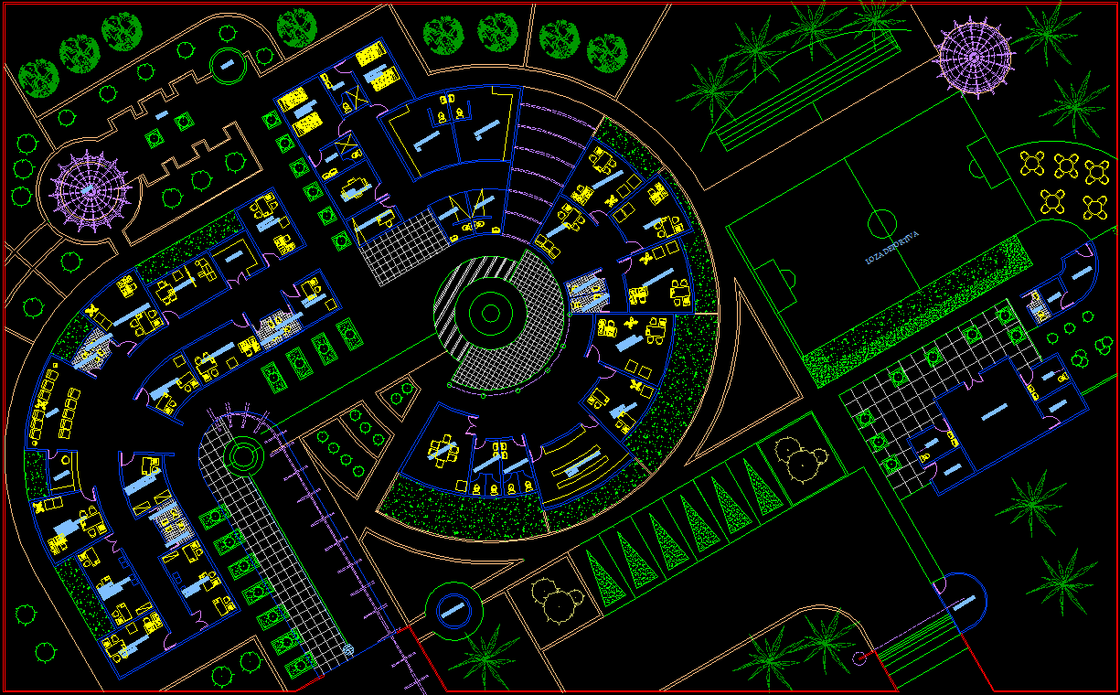This Police Station CAD drawing provides a detailed 2D layout that includes architectural floor plans, parking zones, landscape design, and exterior planning. The drawing presents the station’s complete spatial organization with office spaces, reception areas, detention zones, and circulation corridors. Additionally, it features a landscaped outdoor area with pathways, gardens, and a sports field to enhance the functional environment.