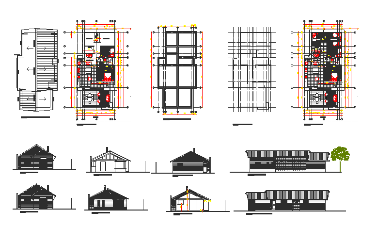 Here the autocad drawing of shops and offices with plans, sections and elevation showing dimensions, furniture layout, circulation detail, renderred elevation, etc.,