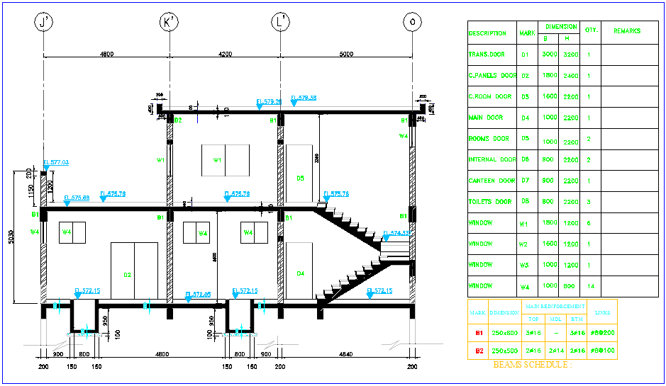 Sectional view of motor control center with view and schedule of door,window and beam view dwg file with view of sectional view of motor control center view with view of door window and beam view with schedule and its position view with necessary dimension view.