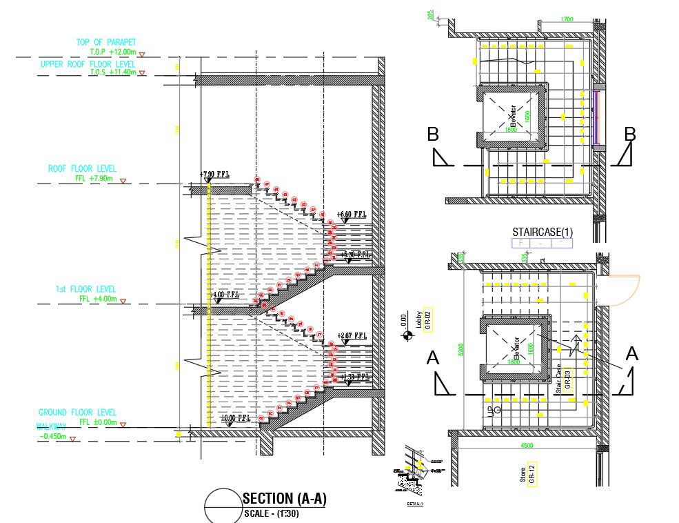 find here section plan, construction detail, layout plan and section plan of civil defence of staircase structure plan.