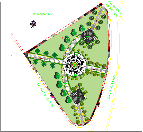 The Architecture Design of Planet Park Elevation that includes tree blocks, top and front elevation, car parking, passing way, tree ways, sitting benches, light, circular tree way, roads and much more of garden design.
