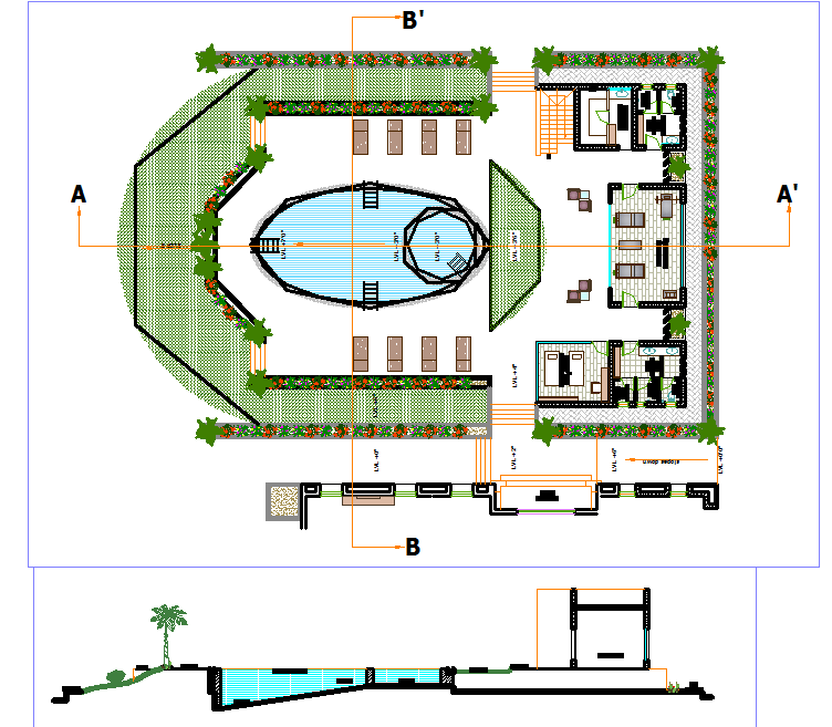 This swimming pool CAD drawing showcases a detailed architectural plan complete with sectional and top views. The layout includes pool dimensions, deck arrangements, surrounding landscape, and seating zones designed to create a functional and visually appealing environment. The sectional drawing provides clarity on depth variations, water levels, and construction details essential for accurate implementation.
