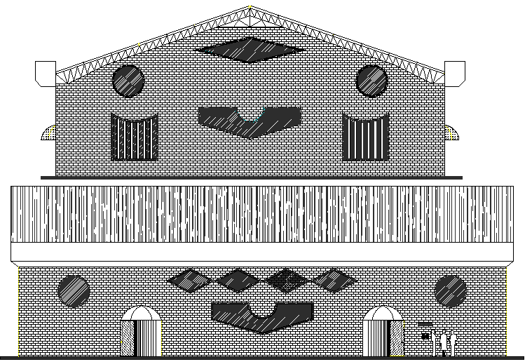 Cultural Center Design and Elevation that includes main and back elevations, doors and windows, detailed stair case construction, symbol, wall construction, roof details, structure plan and much more of cultural center design.