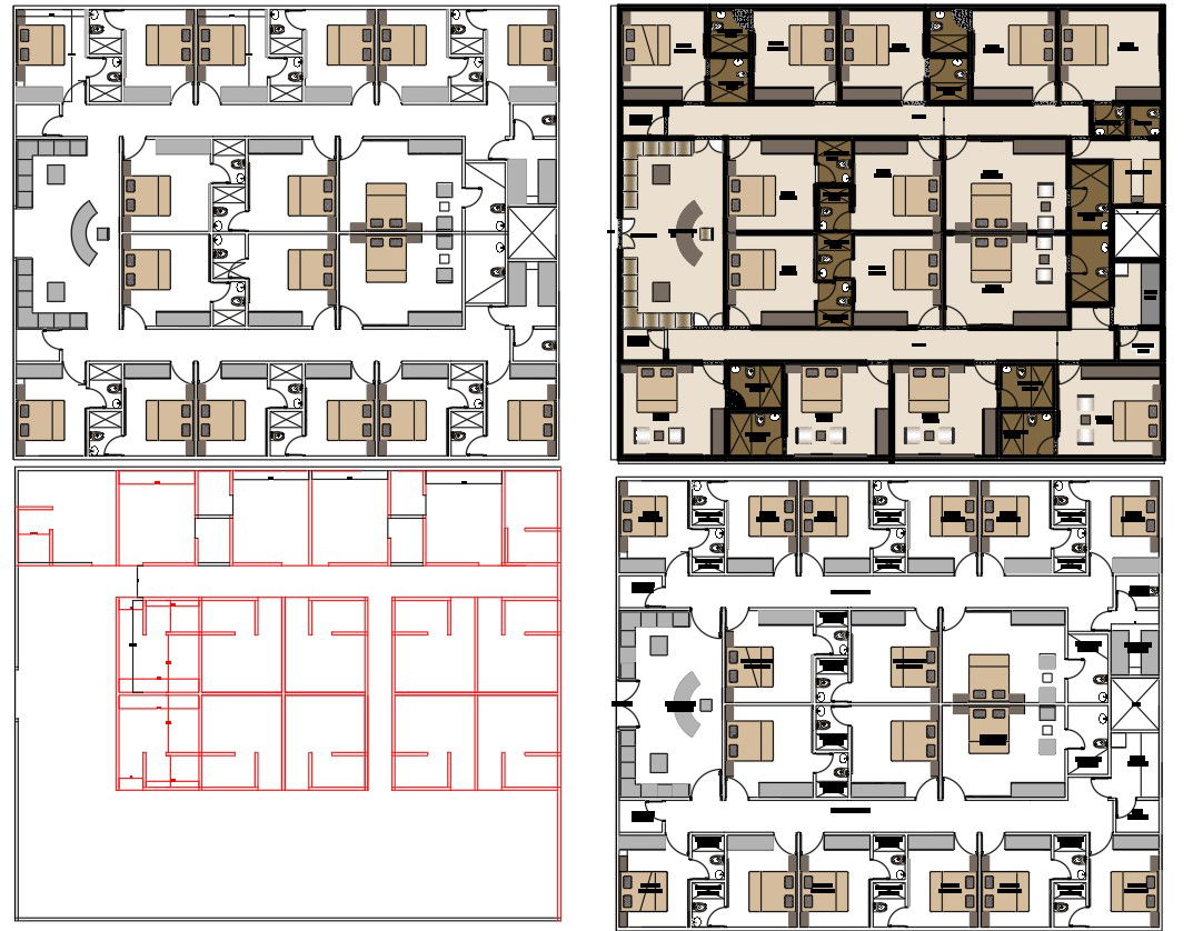 Find here 4 level of Hotel layout plan with structure plan, bedrooms detail with furniture plan and foundation plan of Hotel project