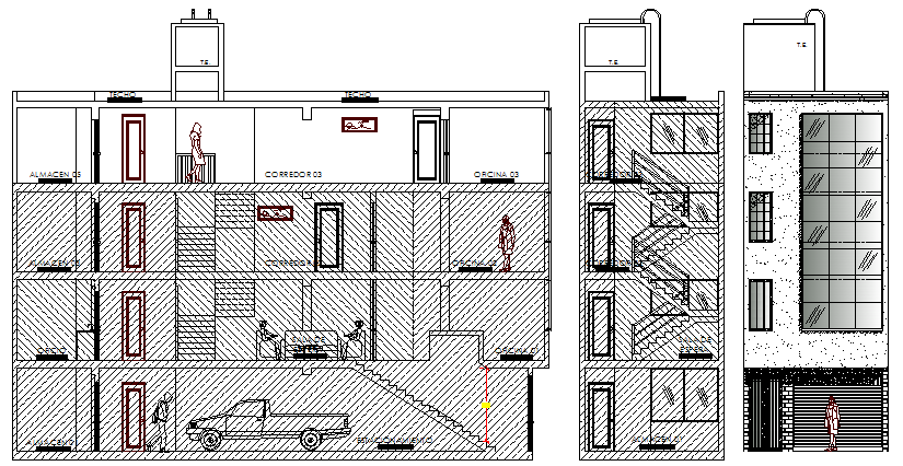 Store Building Architecture Elevation and Design with detailed view front elevation with doors and window, basement parking area, offices, core-odor, flooring details, balcony, reception, stair cases and much more of building design.