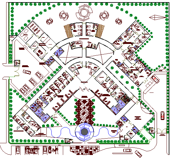The Architecture Layout of Multi Flooring Hotel Elevation that includes top view of hotel, all sided elevations, circular entry gate, outdoor parking for visitors, garden, security guard cabin, office, reception area and structure details of hotel design.