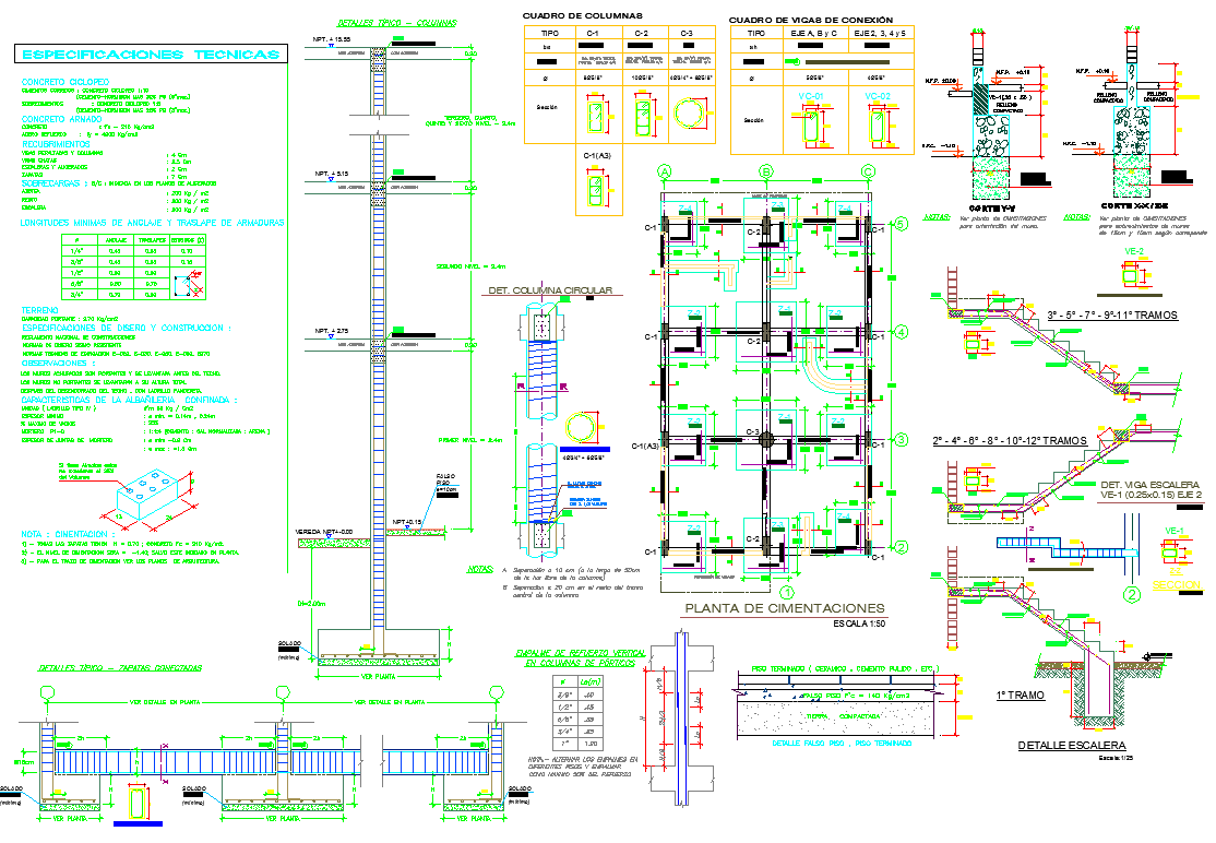 elevation of the column in with details with description. Foundation plan with foundation detail, type of foundation as raft foundation with column detail and also circular column. Elevation of stairs with details provided.Also provides no. of bars and stirrups detail.