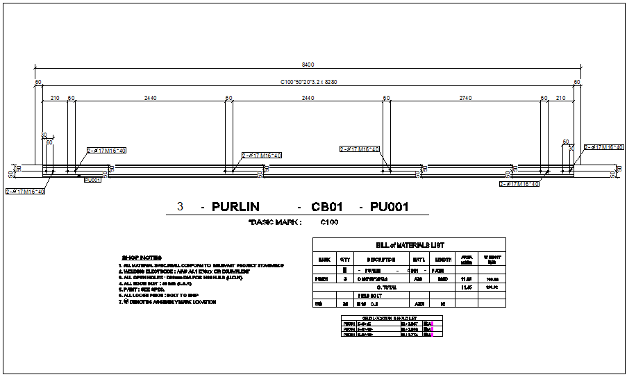 Purling detail view of structural design with grid location dwg file with view of grid