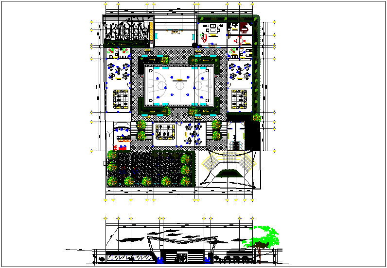 landscape view of sport area with parking and garden view and seating and washing area and view of court for multiple use and man sport playing view in court and view