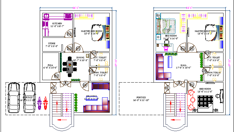 Bungalow Design And Elevation that includes ground floor plan, first floor plan, car parking, drawing, pooja room, entry gate, common toilet, dinning, attach toilet, store, kitchen, master bedroom, hall, bedrooms and much more of bungalow design.