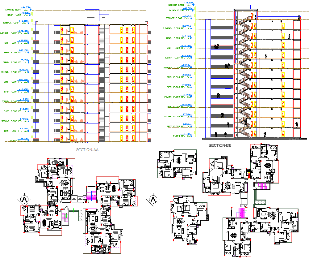 This AutoCAD DWG file provides a detailed architectural design layout of a high-rise housing project. The drawing includes complete floor plans, sections, and elevations, offering a clear understanding of the building’s vertical and horizontal distribution. Each floor level is thoughtfully planned with residential units, staircases, lifts, and service zones, making it ideal for modern urban residential developments.