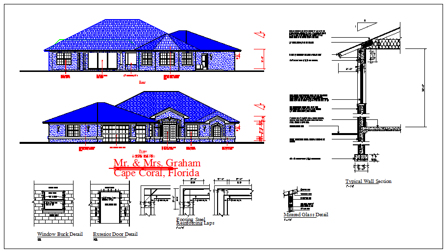 Rear & Front Side Elevation detail & Window Buck Detail, Exterior Door Detail, Footing Steel Reinforcing Laps, Mitered Glass Detail, Typical Wall Section, etc.
