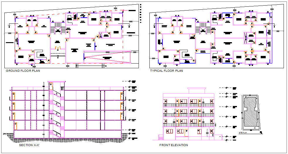 Ground floor plan,elevation and section view of apartment dwg file with view of ground