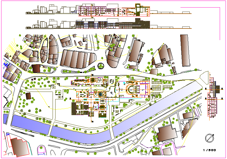 Theater design with landscape view and elevation view dwg file with landscape plan