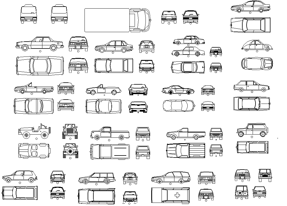 Vehicle Blocks dwg file. top view, side, and front elevation design of different vehicle blocks in autocad format.