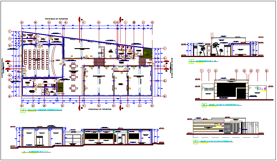 Educations center plan view, sectional & elevation view with interior view dwg file