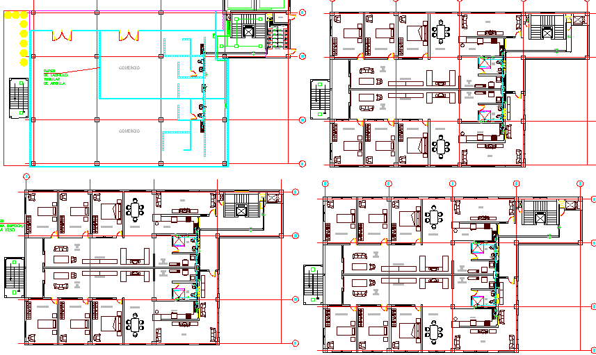 Residential Building Five Levels Structure Details that includes main entry door, lobby, dining area with furniture, hall, living area, toilets and bathrooms, kitchen, wash area, bedrooms, master bedroom and much more of residential building.