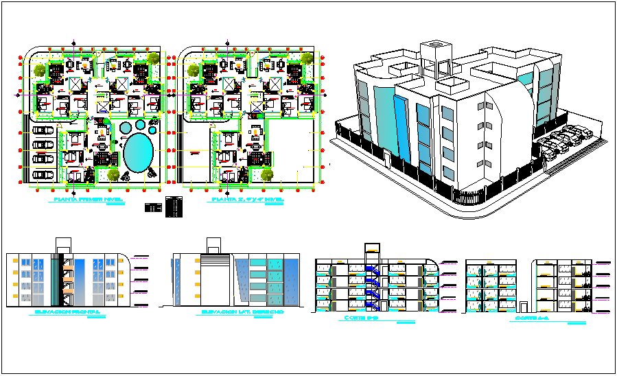 Isometric view of resident flat design with plan,elevation and section view dwg file