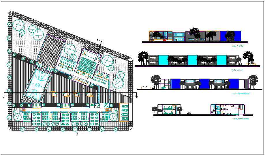 Landscape view and elevation view of collage dwg file with landscape view with road