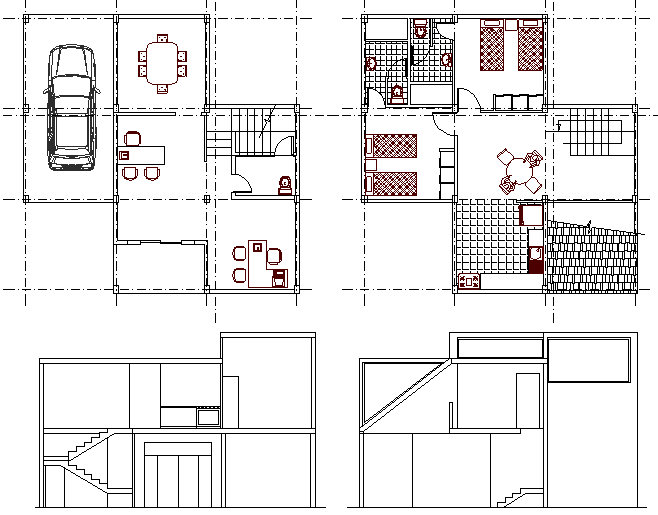 Community Police Station Houses Elevation and Structure Details that includes detailed view of front and back elevations, car parking area, bedrooms, general toilet, kitchen, toilet, dining area, offices, rooms, staircase details and much more of police station house design.