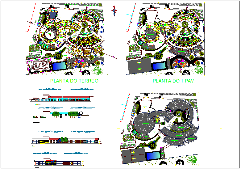 Landscape view of school with elevation and sectional view dwg file