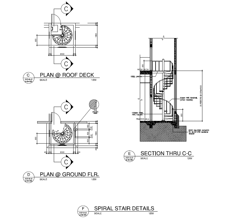 Find here section plan, elevation design, and layout plan of Spiral Staircase project.