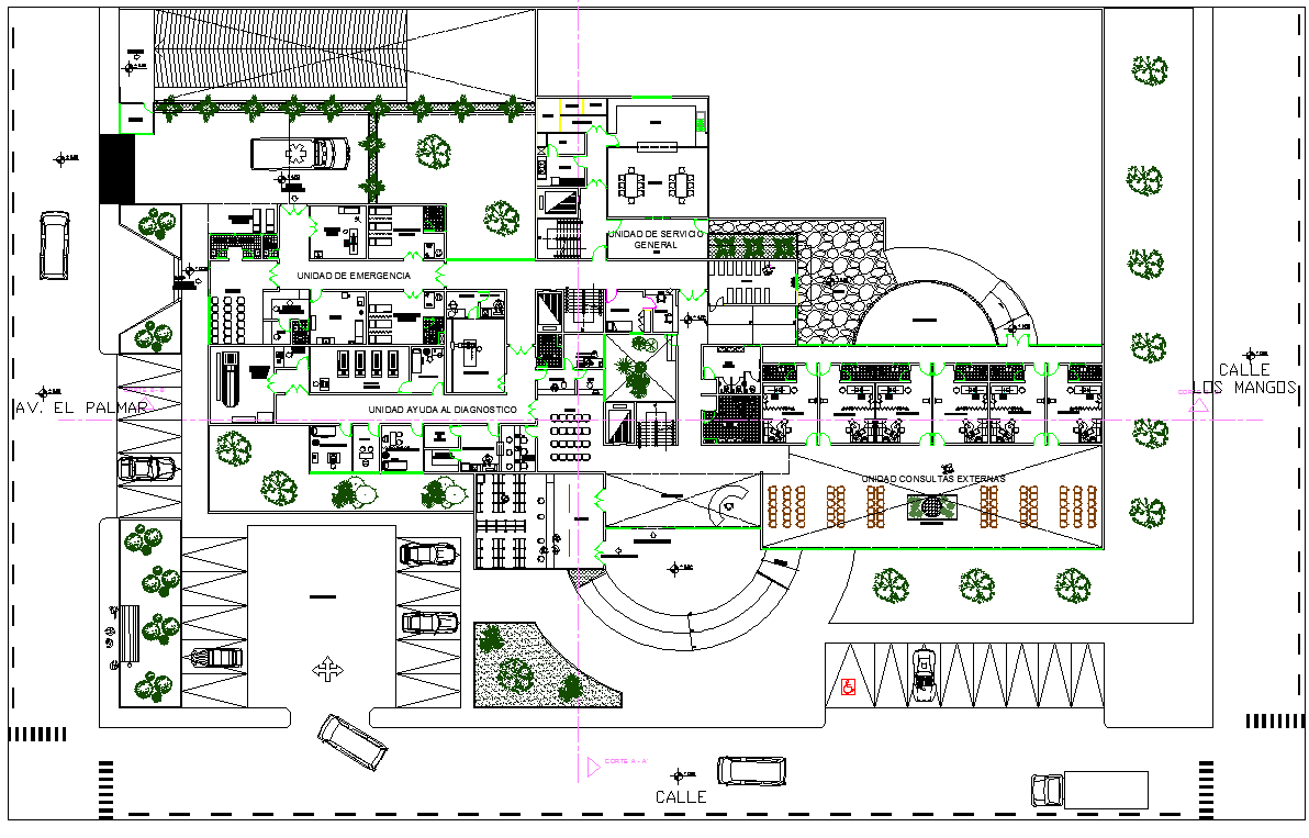 the architecture layout plan include consulting room, reception area, waiting area, operation theater, admit room and vehicle parking of hospital project.