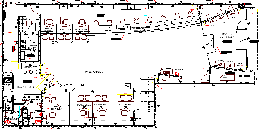 Bank Office Furnished Plan and Structure Details that includes entry door with guard, waiting and sitting area, cash counter, reception, accountant office, manager cabin, toilets for staff, dining area, kitchen or store room and much more of bank details.