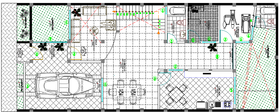 Single Family Dwelling Architecture Layout that includes entry door, hall, kitchen, living room, furniture details, bedrooms, laundry area, balcony, dining area, family room, study room and much more of house design.