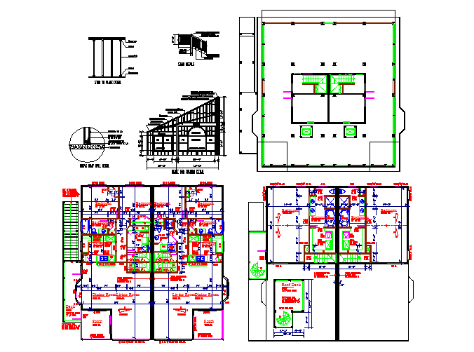 gable end framing detail, break away wall detail, stud to plate detail, stair details, roof deck, dining room, living room, bed room, bathroom, kitchen.