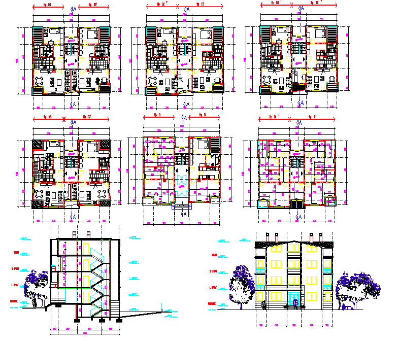 In this apartment cad file, you will find clearly defined centerline floor plans and vertical section details that help in understanding the structural composition of the building. The drawing provides a clear representation of the entire layout, including facade elevation and staircase alignment. Perfect for professional and academic use, this 2D cad drawing serves as an excellent reference for residential building design and presentation drawings. The file ensures accuracy, clarity, and an efficient workflow for anyone involved in architectural drafting or visualization.