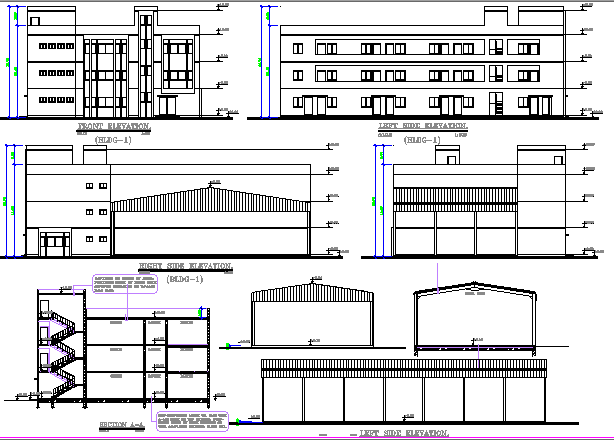 School Architecture Layout and Elevation that includes front and back elevations, staircase view, doors and window elevations, wall construction, cuts, column and beam details, wall design and much more of school design.