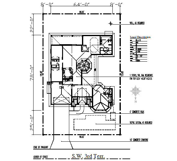well, as required, legal description, 1 story, sgl fam residence, fin flr elev +9.00' n.g.v.d. 4' concrete walk, septic system, as required.