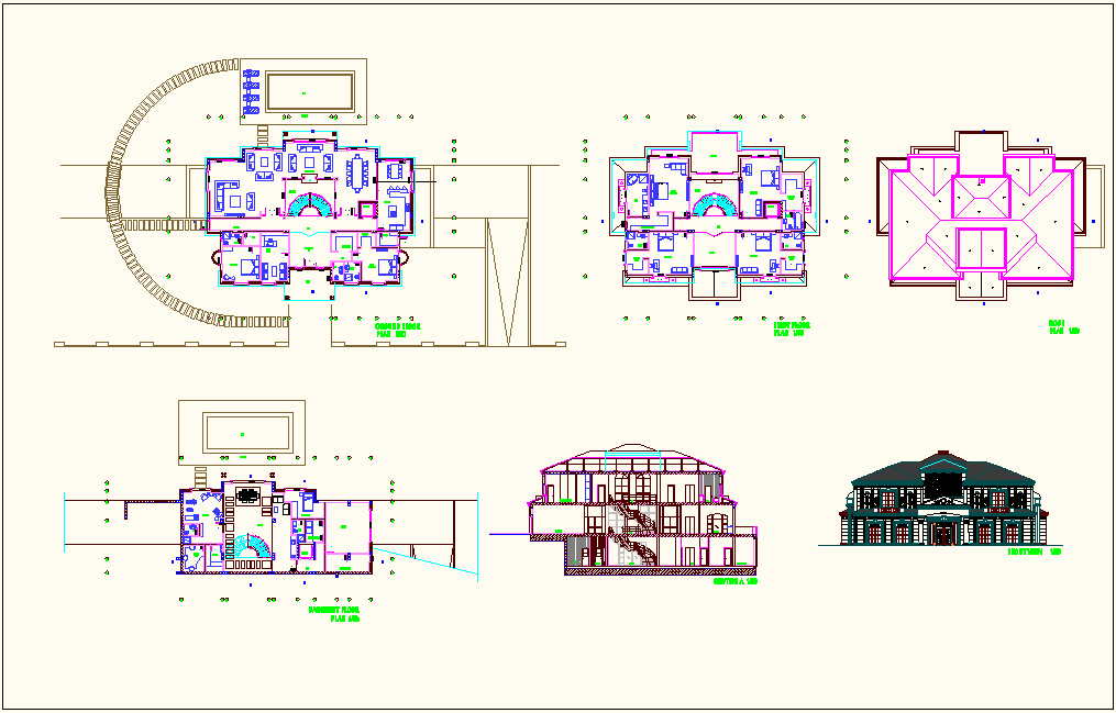 Plan and sectional view with basement plan and sectional and elevation view for bungalows dwg file