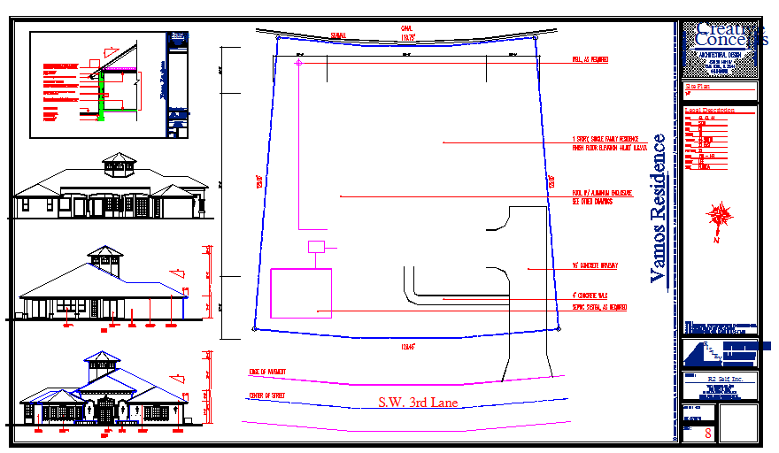site plan, wall section, exterior elevations, floor plan, exterior elevations, left & right, foundation plan, roof plan, electrical plan, approximate finished grade. aluminum drip edge, fascia & ventilated soffit over 2x6 barge.House Architectural Project With Side Elevation.