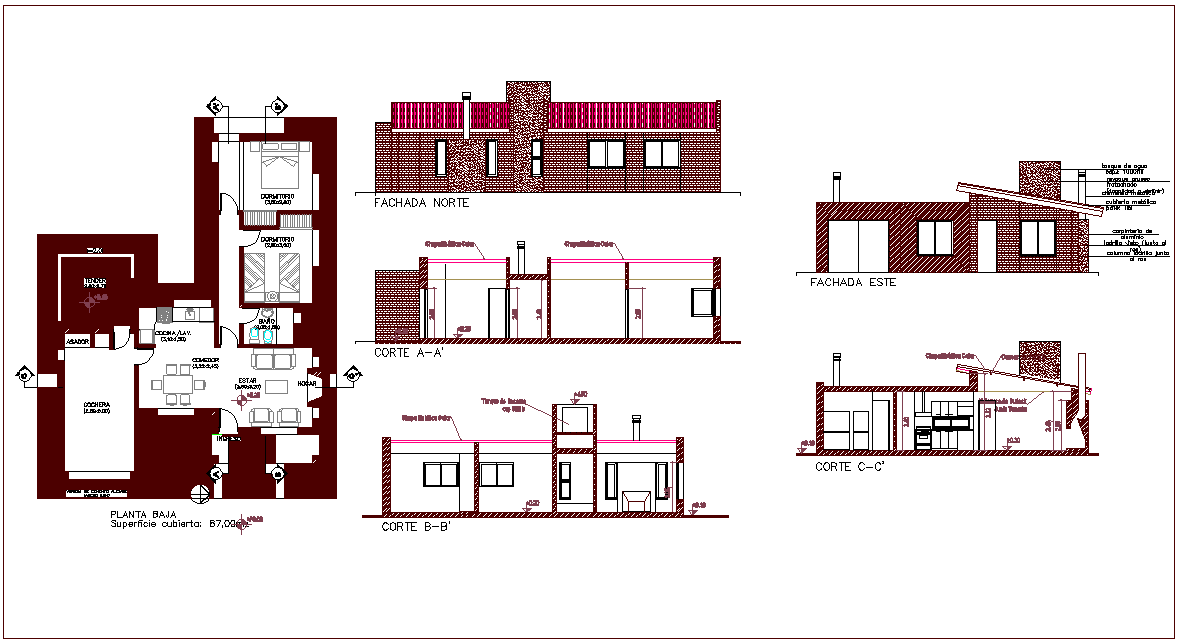 Cottage house design view with plan and sectional view dwg file with plan view with bedroom,kitchen