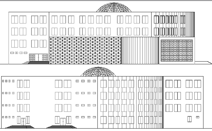 Main Elevation of City Library Architecture Layout that includes front and back elevations, doors and windows, staircase, wall design, wall construction, tome view, roof view, foot view and much more of city library.