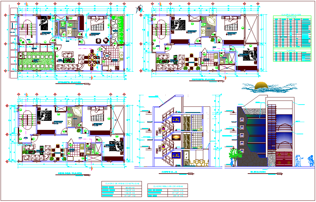 Plan,elevation and sectional view of apartment building with door and window detail dwg file