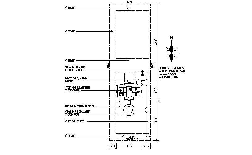 well as required minimum 75' from septic system, proposed pool w/ aluminum enclosure, 60' easement, septic tank & drain field, as required, 10' wide concrete drive,etc.