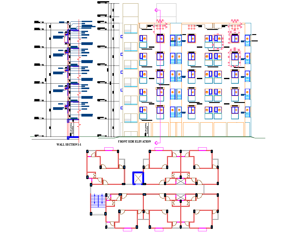 Apartment Building plan autocad file. layout plan, structure plan, front side elevation design and wall section plan of apartment building project.