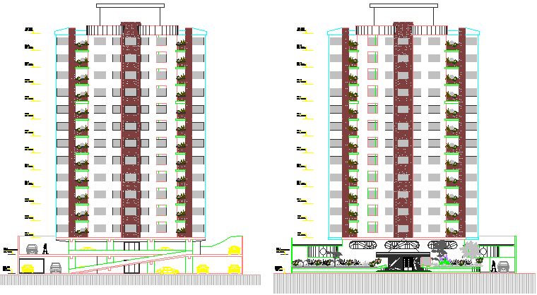 Multi-Family Housing Building Design and Elevation that includes a detailed view of front and back elevations, section plan, door and windows, staircase, wall design and construction, roof and terrace view and much more of building design.