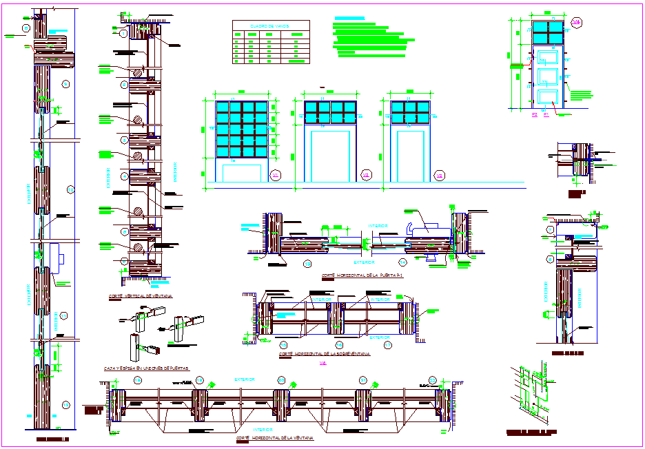 with wooden joint of door and window and sectional view with detail of blows and interior and extirior