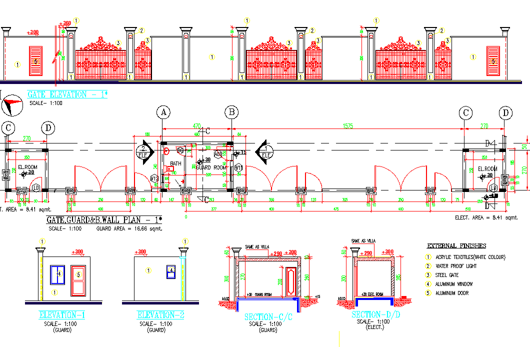 Compound Wall and Gate design dwg file. find here still gate design, aluminium door and window, waterproof light and compound wall and column design in AutoCAD format.