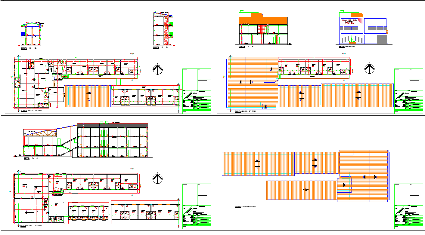 find here layout plan all floor level, section plan, roof plan and elevation design of construction building hotel project detail.