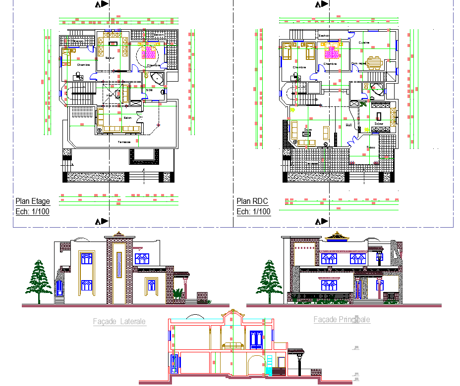 find here layout plan of the ground floor plan and first-floor plan with structure detailing, furniture arrangement, section plan and elevation design of residence project.