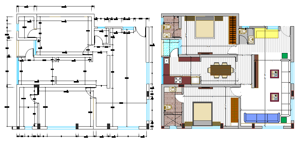 2bhk residential planning for housing of dwg file, 2bhk housing planning design with dinning room, kitchen room facility, living room