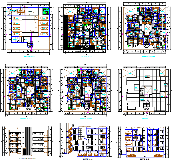 building structure elevation and section view of dwg file, building structure, building elevation view, building parking area