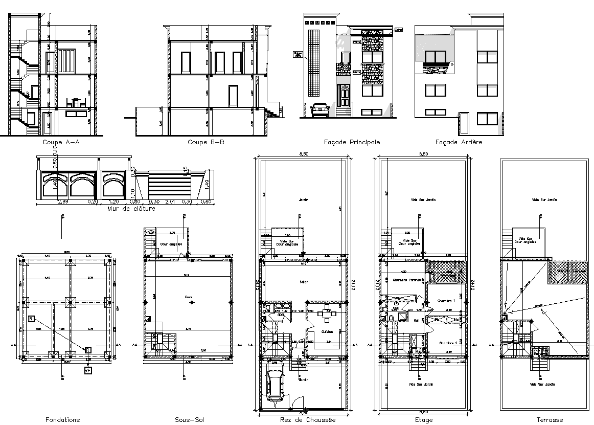 The architecture layout plan of the ground floor plan, first-floor plan, terrace plan, foundation plan and beam detail, compound wall design, section plan and elevation design of house project.