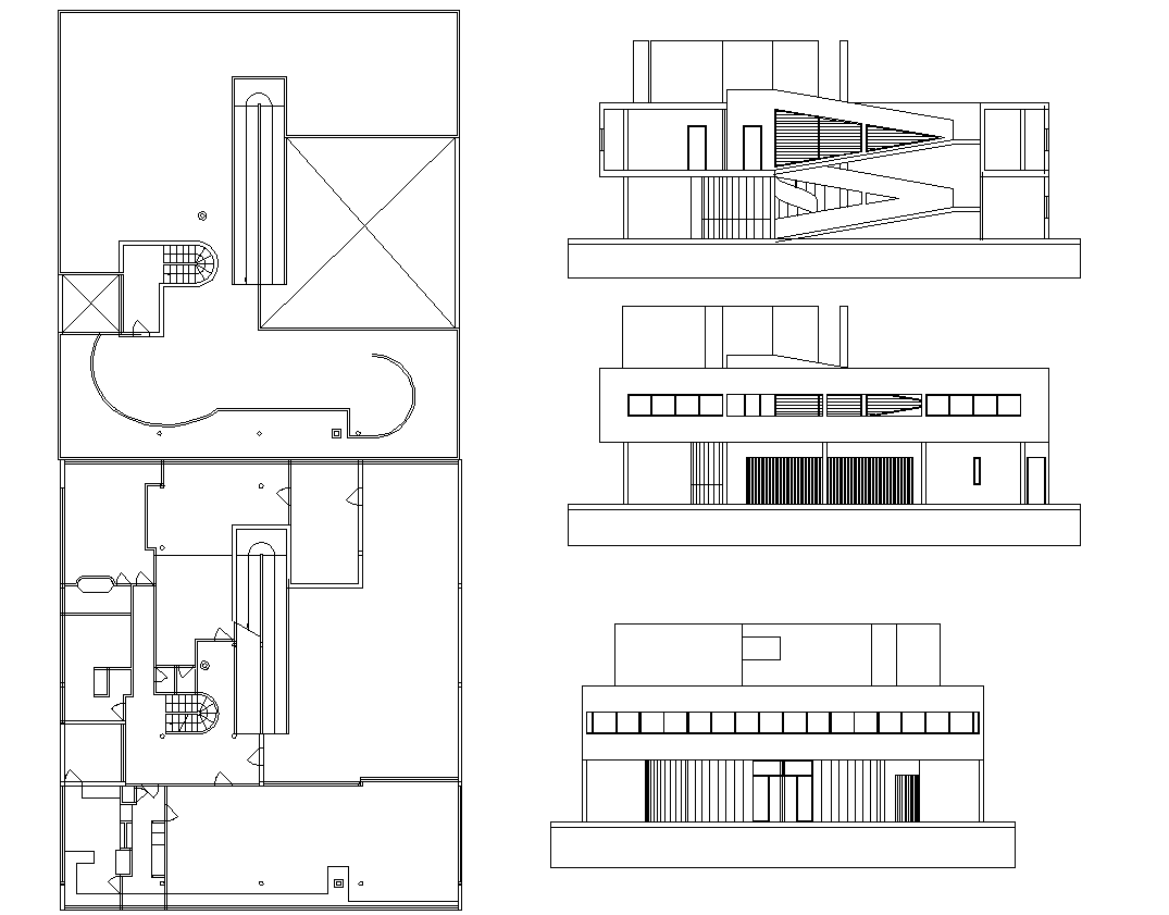 Modern House Design dwg file. find here the architecture layout plan ground floor, first floor and all side modern elevation design of house proje